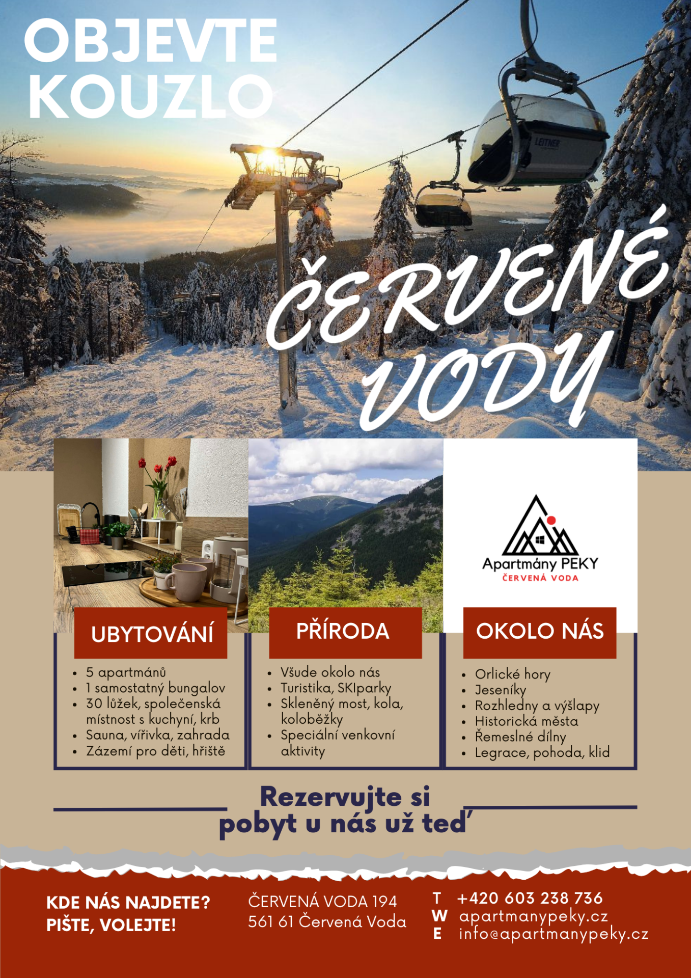 Apartmány Peky se nachází v malebné obci Červená Voda, na pomezí Orlických hor a Jeseníků. Tato lokalita je ideálním místem pro všechny, kteří hledají klid, čistou přírodu i aktivní dovolenou v každém ročním období.